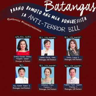 Panawagan para sa Mga Kongresista ng Batangas: Tutulan ang Anti-Terrorism Bill!Sa hindi malinaw na konteksto ng bill, nabibigyan ng labis na kapangyarihan ang kapulisan, at nanganganib na maisantabi ang prosesong pangkatarubgan. Makakapanghatol ang mga nasa otoridad batay sa hinala sa halip na sa masusing imbestigasyon at proseso. Isang malaking sampal ito sa karapatan natin ng malayang pananalita, samakatwid ay sa ating kalayaan pati na rin sa ating pundamental na karapatang pantao. Ang pagpapasa ng nasabing bill ay isang malaking kapabayaan ng mga kinauukulan sa kapangyarihang hiram lamang nila sa mga mamamayan.740 of 800 SignaturesCreated by Carlos Enrico Villanueva
